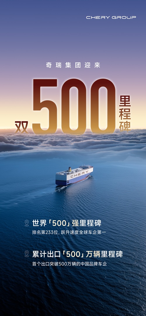 秉持长期主义,奇瑞集团迎来了历史性的“双500”里程碑——“世界500强排名跃升速度全球车企第一”和“首个出口突破500万中国品牌车企”。在《财富》7月29日最新发布的世界500强榜单中,奇瑞集团排名第233位,较去年大幅跃升152个位次,跃升速度全球车企第一。“双500”里程碑,不仅标志着奇瑞全球化战略实现突破性进展,也印证了奇瑞以长期主义穿越周期的耐力与韧性。