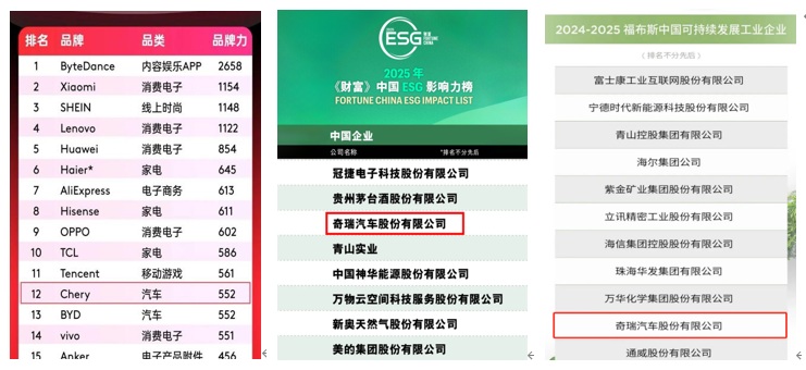 秉持长期主义,奇瑞集团践行ESG理念,加快品牌向上,致力于打造世界一流品牌,成为创新驱动、全球信赖的智能出行生态引领者。在谷歌与凯度联合发布的“2025年度中国全球化品牌50强”榜单中,奇瑞连续第八年上榜,排名总榜单第12位,蝉联汽车品类排名第一;连续第二年入选《财富》中国ESG影响力榜,还成为福布斯中国2024-2025可持续发展工业企业榜上唯一的车企,在全球范围内收获了越来越多的品牌信赖与认可。