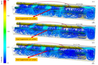 同时,该矿对采煤机喷雾系统进行优化,选用特制喷头与新型喷雾模块,调整煤机外喷雾安装位置,确保水雾全面包裹滚筒,减少滚筒截割煤体时的产尘量;在支架前梁与架后掩护梁下方安装由3个喷雾嘴组成的架间喷雾降尘装置,移架、割煤期间自动开启下风侧喷雾,在前、后部运输机上部空间形成水幕区;在工作面前部运输机头、后部运输机头、转载机机头、皮带机头等转载点安装封闭式降尘喷雾,保障系统运行期间喷雾正常开启,抑制转载点煤尘飞扬。