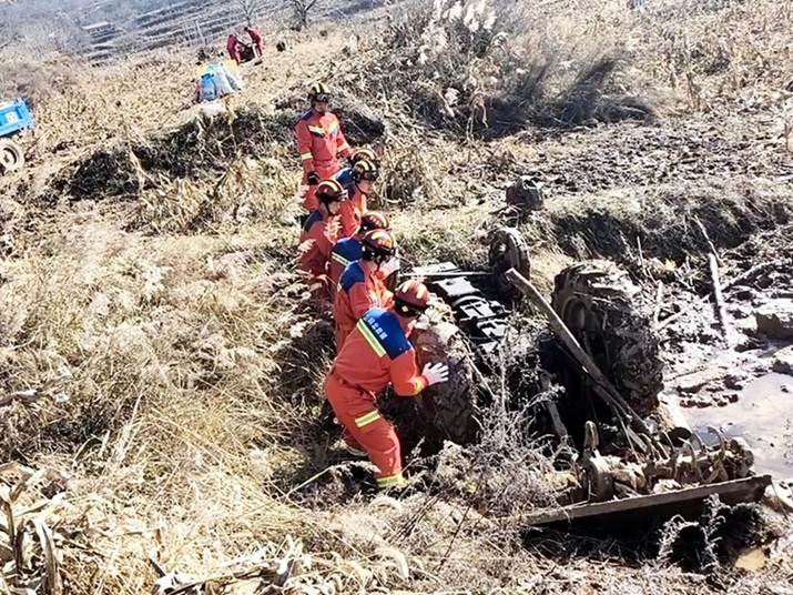 抵达现场后,眼前的景象令人揪心不已:一辆农用四轮车侧翻在湿滑的田埂上,沉重的车身深深陷入泥泞,牢牢压住了一名中年村民。他的腿部被死死卡在车架与黏腻的地面之间,身体无法动弹,不时发出痛苦的低吟。更棘手的是,农用车重达1.1吨左右,部件交错缠绕,加之土地泥泞湿滑,车轮深陷泥中导致车身极不稳定,任何轻微的晃动都可能对村民造成二次伤害,如救援不及时可能会危及生命……