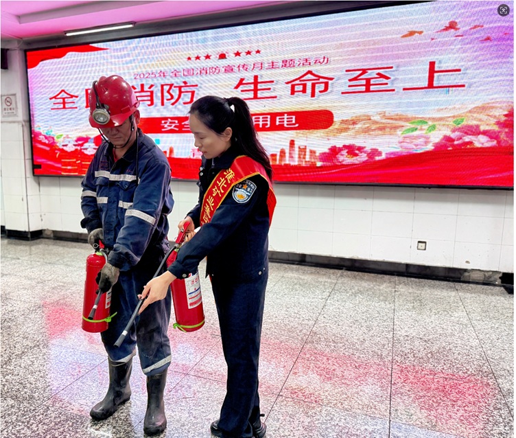 在井口大厅、职工食堂等人员密集场所以及35KV变电所、井口库房等关键地点,青春宣讲员结合矿井实际案例,通过“理论讲解 + 现场演示”的方式,重点普及初期火情扑救方法、火灾发生避险技巧,现场演示灭火器操作步骤,让职工在沉浸式体验中强化安全意识,有效提升了应对突发火情的处置能力。