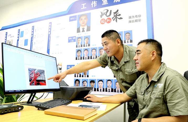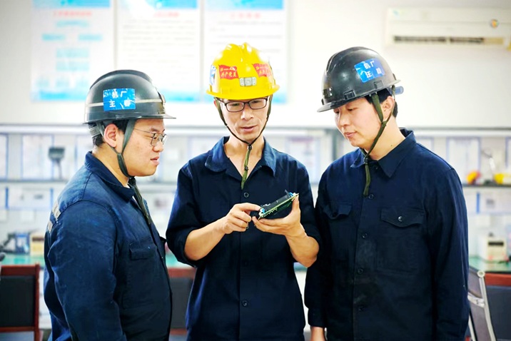 金平均劳模创新工作室,金平均(图右一)与徒弟对设备进行优化改造
