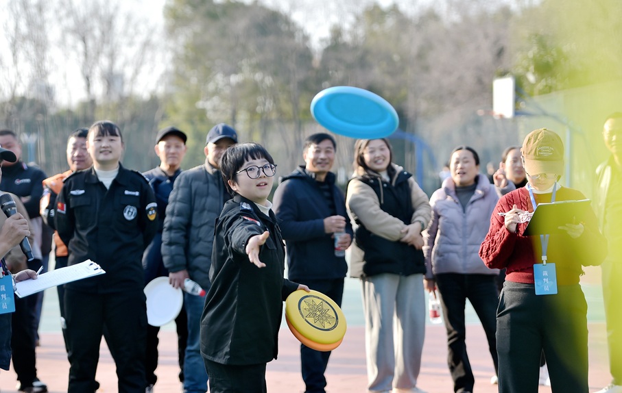 2025年12月16日,在安徽省合肥市庐州公园篮球场,职工在参加“扔飞盘”比赛。为丰富新就业劳动者文体生活,当日,合肥市庐阳区总工会、大杨镇总工会、庐州公园管理处联合开展“凝‘新’聚活力 奋斗新征程”庐阳区新业态劳动者趣味运动会,来自庐阳区11个乡镇街道的外卖小哥、快递员、网约车司机等新就业劳动者参加了“扔飞盘”、“足式保龄球”、“乒乓球托球跑”等趣味项目的比赛。