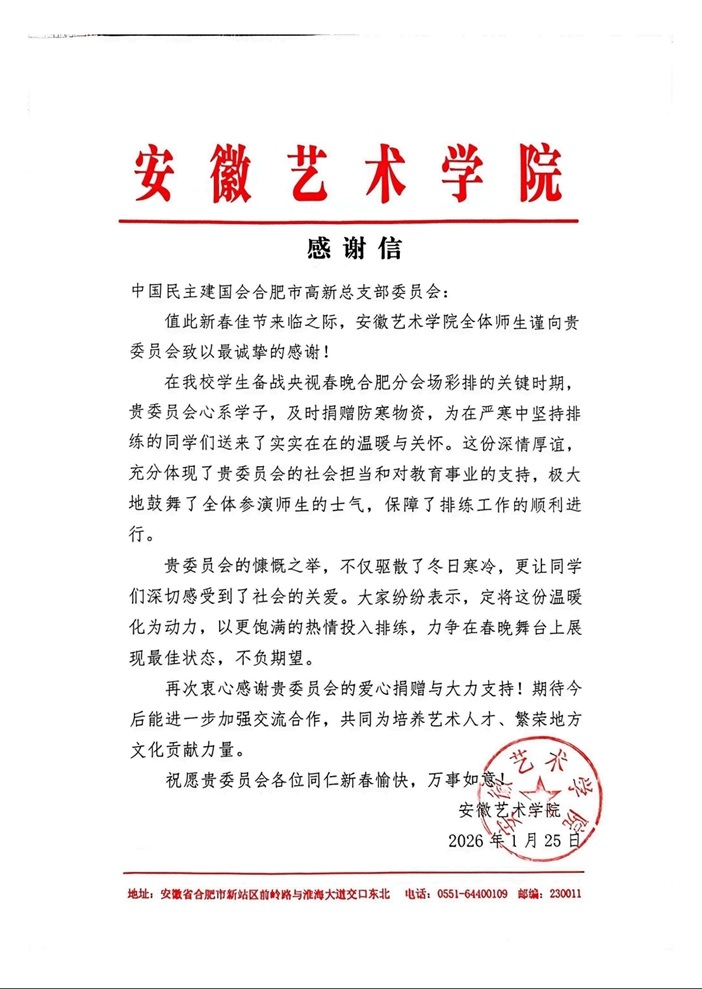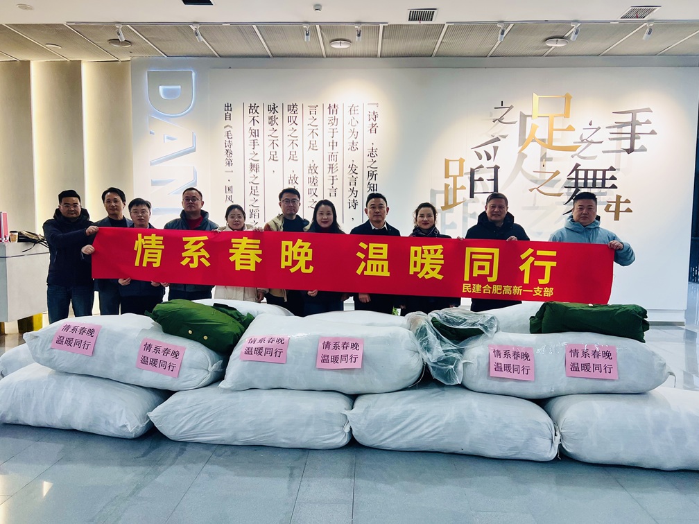 2026年1月25日下午,民建合肥高新一支部组织会员代表赴安徽艺术学院,开展“情系春晚温暖同行”慰问活动,亲切看望正为央视春晚合肥分会场演出紧张排练的师生,并送上御寒大衣等慰问物资,在寒冬中传递了浓浓的温情与关怀。