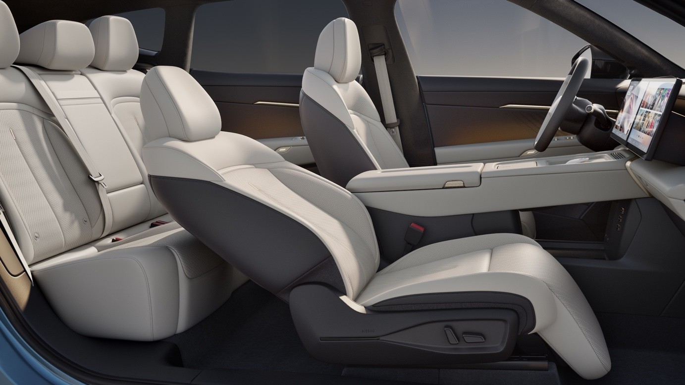 舒适体验的进阶,从每一席座椅开始。与众08配备高定Nappa真皮座椅,主驾座椅可进行12向电动调节,含气动腰托及位置记忆功能,支持加热、通风与十点舒压按摩。女王副驾打造专属舒享空间,14向电动调节配合大尺寸电动腿托、超宽柔光化妆镜与14.96英寸专属娱乐屏,靠背可调至120°舒享躺姿,也可一键切换180°大床模式。后排同样兼顾舒适与实用,靠背角度10°电动可调,配备左右折叠桌板、主/副驾座椅靠背磁吸接口(支持充电)磁吸接口。前排座椅后倒可组合成超大后排航空座椅,全座放平与后备箱齐平无台阶。