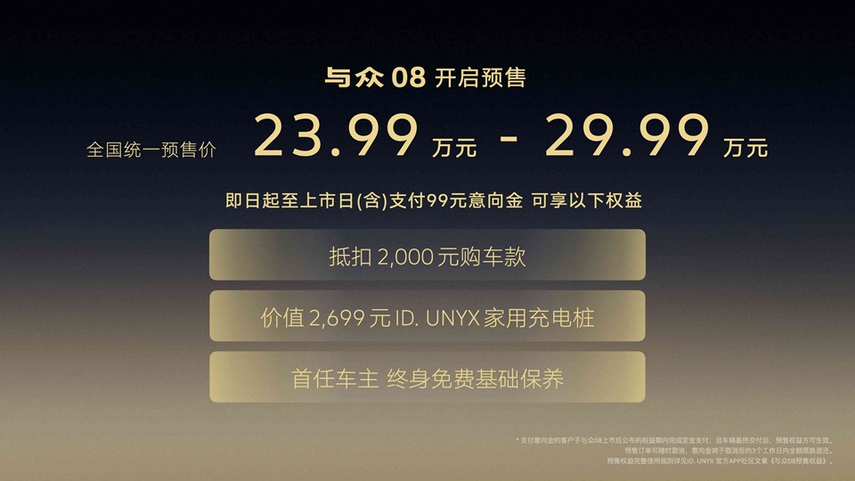 以与众08为序幕,金标大众积蓄的势能正全面释放,并以先锋前卫的进击之姿,加速迈向全新的发展阶段。即日起,用户支付99元意向金,即可尊享三重礼遇:99元意向金直接抵扣2000元购车款;首任车主终身免费基础保养;赠送价值2,699元ID. UNYX家用充电桩。目前,与众08已陆续进入金标大众门店,客户可于门店预约试驾体验。