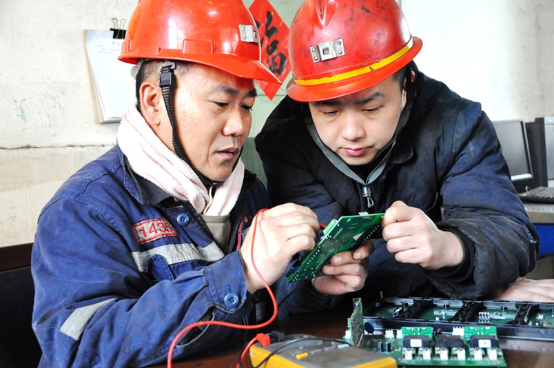 3月14日,安徽淮北矿业集团朱仙庄煤矿运输区,师傅王忠贵(右)正手把手向徒弟吴松传授电路板故障维修技术。今年以来,该矿把解决问题、破解难题、提升技能作为职工培训的出发点与落脚点,实行以班组为单元的小讲座、小讨论、小提问灵活培训模式,让培训更接地气、更贴实战。鼓励技术骨干扎根现场,面对面讲、手把手教,确保职工听得懂、学得快、用得上。精准施教