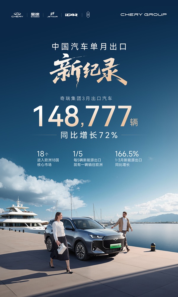 奇瑞集团3月出口销量再创纪录:继2月成为首家累计出口突破600万辆的中国品牌车企后,3月单月出口汽车148,777辆,同比增长72%,刷新中国汽车单月出口纪录;一季度累计出口393,311辆,同比增长53.9%。至此,奇瑞已连续11个月单月出口突破10万辆,继续领跑中国汽车出口。
