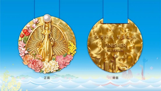 赛事奖牌中央主体为蚌埠城市标志性雕塑“珍珠女”,她双臂托举珍珠,里面是赛事LOGO,象征着蚌埠作为“珍珠城”的独特魅力,也寓意着对跑者完赛荣耀的至高礼赞。