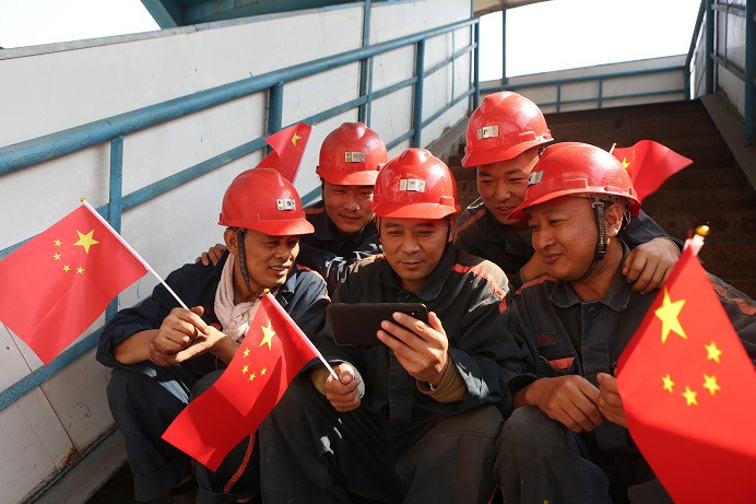 10月1日,安徽淮北矿业桃园矿职工在工作现场收看新中国成立70周年庆祝活动直播,广大一线矿工带着对祖国的热爱和深深的祝福,共同见证这一激动人心的伟大时刻。
