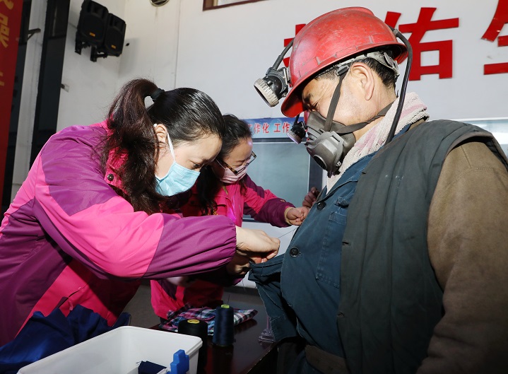 为助推首季安全生产开门红,连日来,安徽淮北矿业集团童亭矿女工委组织协安员来到副井口开展了 “安全知识”大转盘、亲情缝补窑衣。