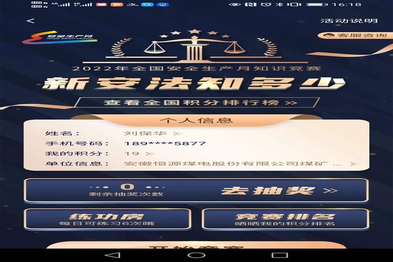 恒源矿“安全生产月”活动仪式启动后,全矿各单位积极响应,以开展“遵守安全生产法,当好第一责任人”活动为契机,组织全体员工参加链工宝“新安法知多少”全国安全知识网络竞赛,全体干群利用碎片化时间,进一步丰富自身安全法规、安全管理、自救互救等方面的知识,进一步提高了广大职工自主学习的能力,了解和掌握更多的煤矿安全知识,有效地促进了岗位人员按章作业行为的养成,避免了事故的发生,营造学法、守法、用法的浓厚氛围。