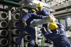 近期,随着装置运行时间的延长,中安联合脱盐水和污水处理装置的处理能力有所下降,为提高水处理设备的运行效率,在对水处理系统反渗透膜综合效能分析评估的基础上,该公司制定了污水装置和脱盐水装置水处理膜系统更换方案并组织实施,及时解决装置安稳生产后顾之忧。图为,6月28日,在中安联合脱盐水装置和煤化工高盐水处理装置,现场作业人员在湿热的厂房内更换反渗透膜。