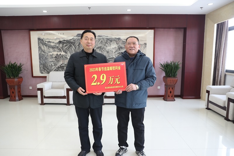 在办公楼四楼接待室,集团公司总工程师傅崑岚将2.9万元的慰问金送到矿长张运海手中,并向朱集西煤矿全体干部职工和家属致以诚挚的问候和新春的祝福。