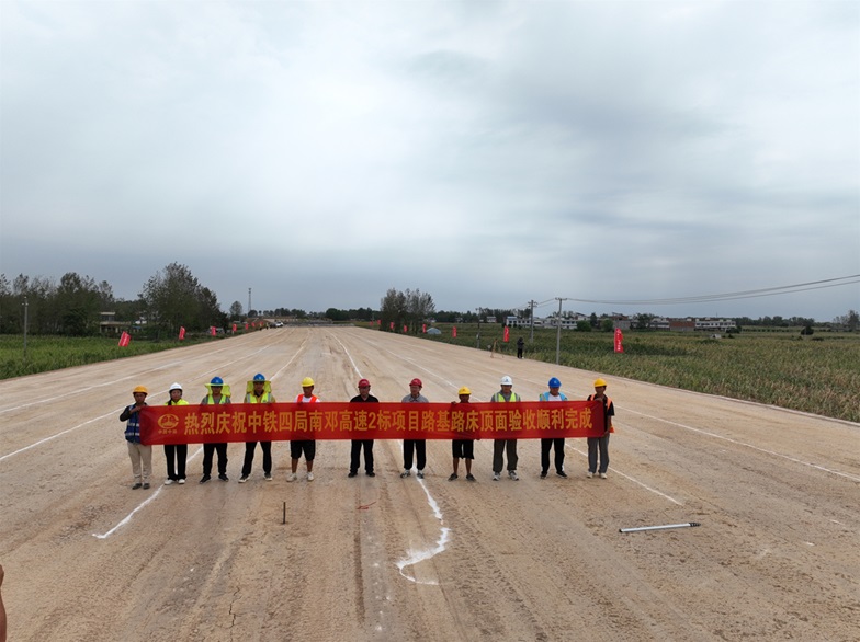 本次交验的路床为中铁四局一公司南(阳)邓(州)高速公路2标主线K64+799-K65+020段路基,长221米,宽27米。在项目全体建设者的共同努力下,经过第三方检测单位和监理单位多方检测,首段路床成功交验。