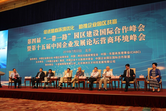 2018年7月22日,姚崇全(右三)在钓鱼台国宾馆召开的第四届“一带一路”园区建设国际合作峰会暨第十五届中国企业发展论坛营商环境峰会上,就创新发展与有关专家进行对话