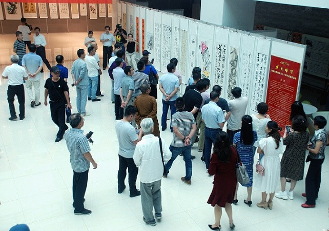该县的书画爱好者在欣赏《成就辉煌》书画作品展