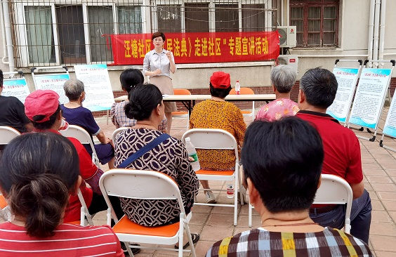 当日,在合肥市瑶海区方庙街道汪塘东区广场,律师为居民讲述《民法典》中物业管理方面法律知识