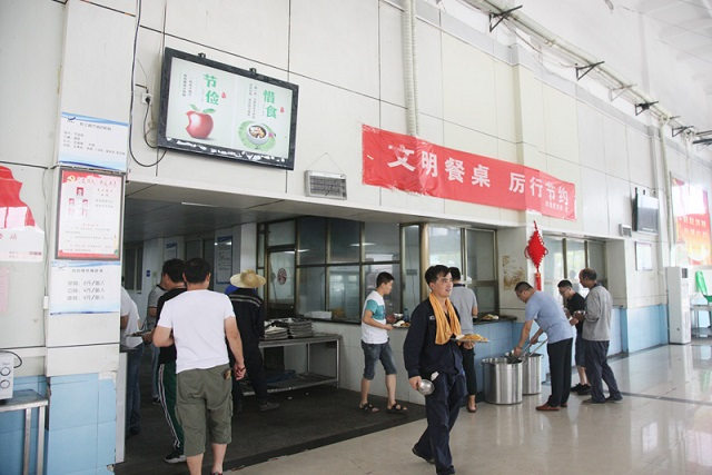 标有“文明餐桌,厉行节约”八个大字的红色条幅,在皖北煤电恒源煤矿餐厅西墙上显得格外耀眼。