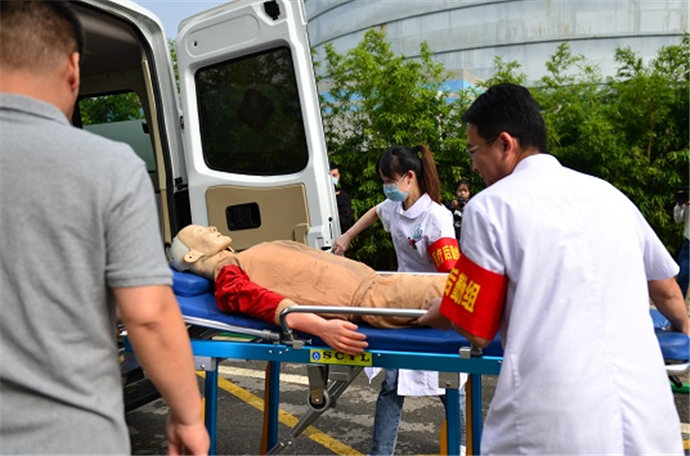 为提高重大事故应急指挥、应急救援、应急配合的快速反应能力,确保重大事故发生后能得到迅速有效地控制,9月23日,安徽合肥市庐阳区应急管理局、庐阳消防大队、杏花村街道、皖能合肥发电有限公司联合开展“危化品泄露应急演练”,通过模拟液氨储罐重大危险源泄漏事故应急救援演练,提高企业员工的安全意识和应急处置能力。图为,当日上午,在合肥皖能发电有限公司,医疗救护人员将受伤工友抬进急救车送医抢救。