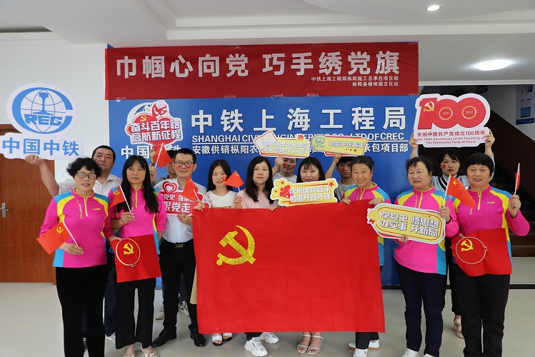 中铁上海工程局三公司枞阳施工总承包项目部联合铜陵市枞阳县横埠镇文化站开展共绣党旗活动。