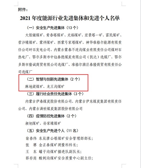 4月6日,内蒙古自治区鄂尔多斯市准格尔旗能源工作暨党风廉政建设工作会议以视频会议形式召开,麻地梁煤矿荣获“智慧与创新先进集体”,为皖北煤电集团走出来企业争了光。