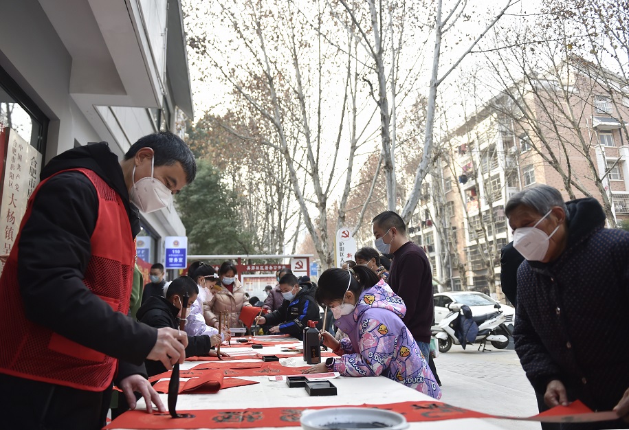 2023年1月9日,在安徽省合肥市庐阳区大杨镇吴郢社区,书法家和小学生一同为居民写春联。春节将至,为弘扬和传承中国传统节日文化,当日,合肥市庐阳区大杨镇吴郢社区开展翰墨传文化笔尖迎新年活动,邀请社区书法家和辖区小学生一同为居民写春联,传承书法文化,感受节日民俗,共同迎接农历兔年的到来。 葛传红 赵莉/摄影报道