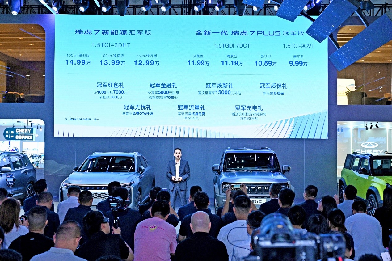 本报记者 张晓梅/吴明 张骅 2023年8月25日,第二十六届成都国际汽车展览会(以下简称成都车展)在中国西部国际博览城盛大启幕。展会当天,奇瑞汽车携瑞虎7家族全新阵容亮相成都车展5号馆,推出10万级SUV价值标杆全新一代瑞虎7PLUS冠军版,以及12万级强动力电混SUV瑞虎7新能源冠军版车型。其中,全新一代瑞虎7PLUS冠军版共推4款车型,官方指导价9.99万-11.99万元;瑞虎7新能源冠