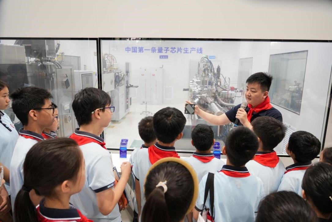 2024年6月1日,安徽省少工委、安徽省量子计算工程研究中心举办“中国自主量子计算机群开放授课活动”90后博士孔伟成带少先队员们参观量子芯片生产线。孙超摄