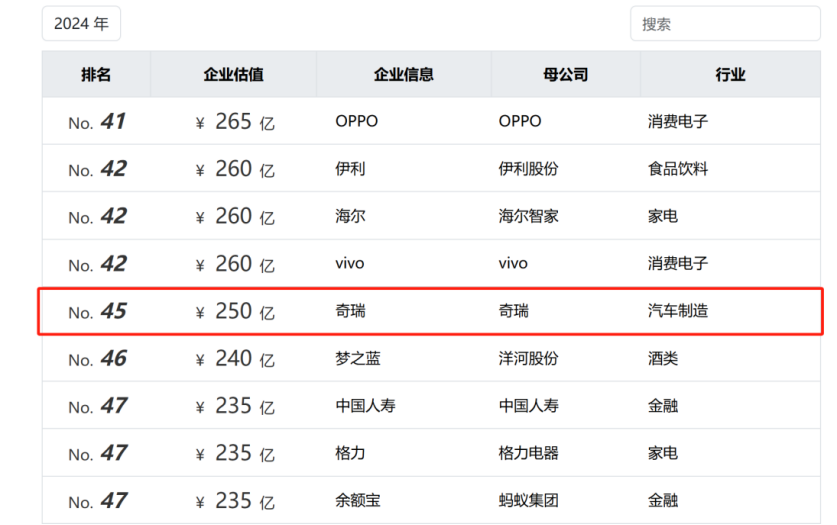 在品牌价值方面,在4月份胡润研究院发布《2024胡润品牌榜》最具价值中国品牌300强中,奇瑞品牌价值增长163%,达250亿元,在全国排名第45位,首次跻身汽车制造行业前三,较去年排名上升82位,其全球市场影响力跨越式跃升。