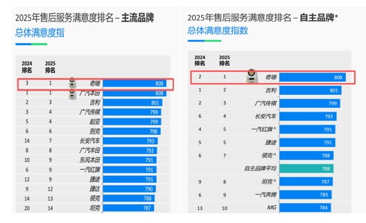 J.D.Power中国售后服务满意度研究已持续开展25年,该研究重点评测了拥车13到48个月内的燃油车车主对过去12个月内在品牌授权经销店的服务经历的满意度。研究显示,2025年中国售后服务满意度研究SM (CSI)的行业总体得分为789 分,较去年提高16分。主流品牌(增长19分达786分)与豪华品牌(增长2分达798分)在售后服务满意度上的差距由上一年的29分缩小至今年的12分。其中奇瑞品牌得分808,与广汽本田并列主流第一,且位居自主品牌第一。