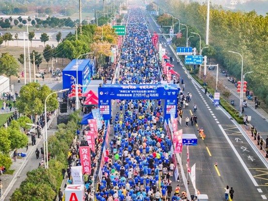 随着发令枪响,蓄势的选手们沿赛道流淌成一条蓝色的交响曲,在朝阳下跃动,与整座城市同频共振。