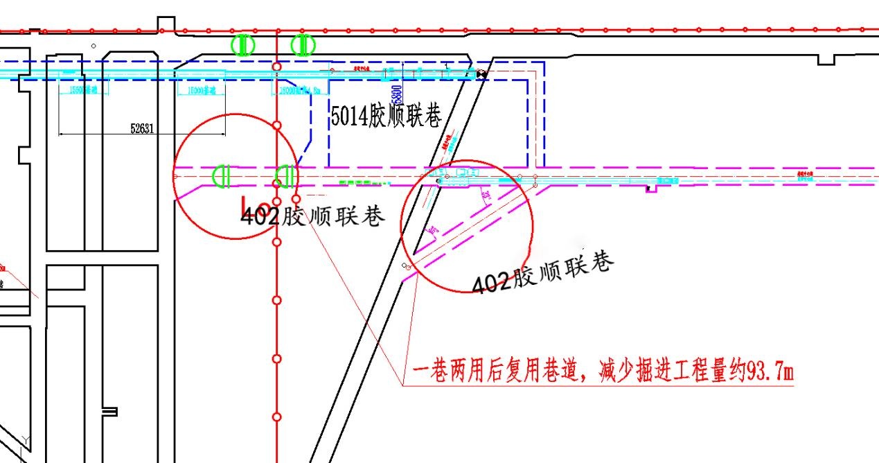 该矿通过对矿井通风系统、运输路线及生产衔接关系的综合分析,确认402胶顺联巷在系统上具备复用潜力,可同时为402工作面与5014工作面的运输与通风提供服务。为此,形成了以该巷道为主体、实现功能集成的优化思路,以减少重复掘进、降低工程成本,并提升生产系统的整体衔接效率。