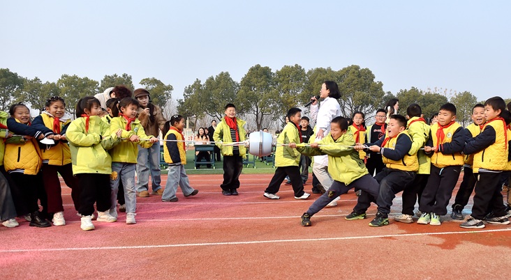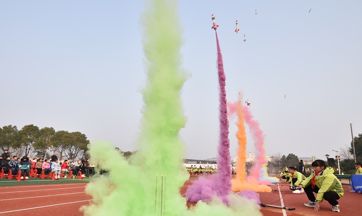 2025年12月30日,在安徽省合肥市安庆路第三小学大杨分校,学生在表演“水火箭”发射。当日,合肥市安庆路第三小学大杨分校举办“学科筑梦 四好同行 三美相伴”学科节成果分享会,“‘水火箭’发射”、“火云掌”、“空气炮”、“无人机”等科技秀逐一亮相,激发了学生科学探索的热情。