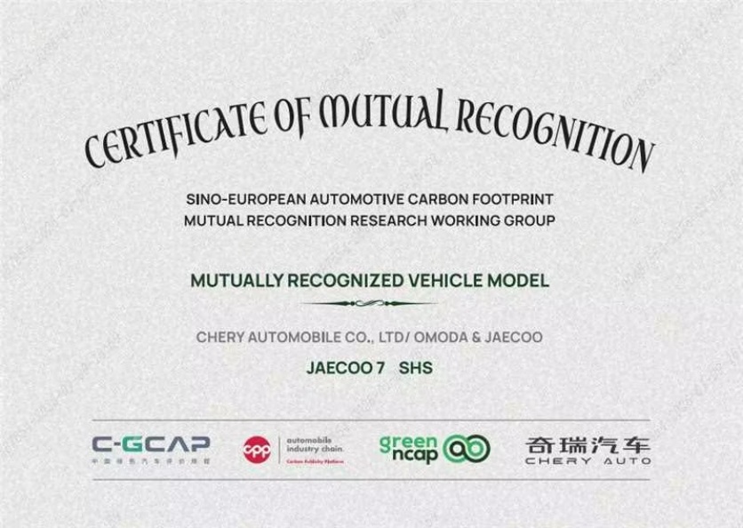 JAECOO 7获中国首张“中欧碳足迹数据互认”证书