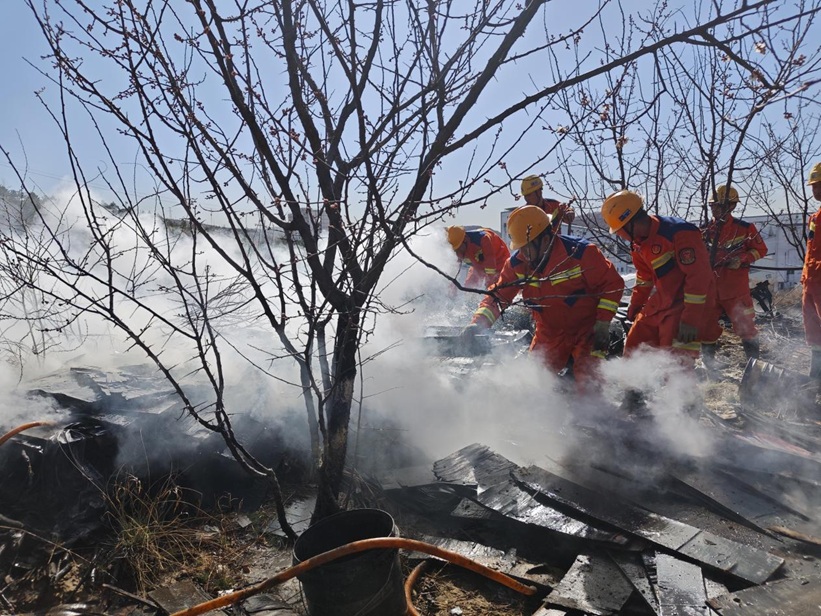 9时35分,车辆抵达位于锅炉房北侧墙头外山坡上的火灾现场,现场距离村民自建房只有四五米距离,周围就是桃树林,若不迅速扑灭火灾,村民的生命财产必然遭受重大损失。查看电源已经切断后,13名救护队员随即手持灭火器进行灭火。虽然火灾面积只有六七十平方米,但因为起火地点堆积的都是易燃的大板和杂物,火势依旧十分凶猛,队员们采取先用灭火器熄灭明火,再用水龙浇灭暗火的策略,10时12分,经过连续半个多小时的紧张战斗,终于降伏了火魔。