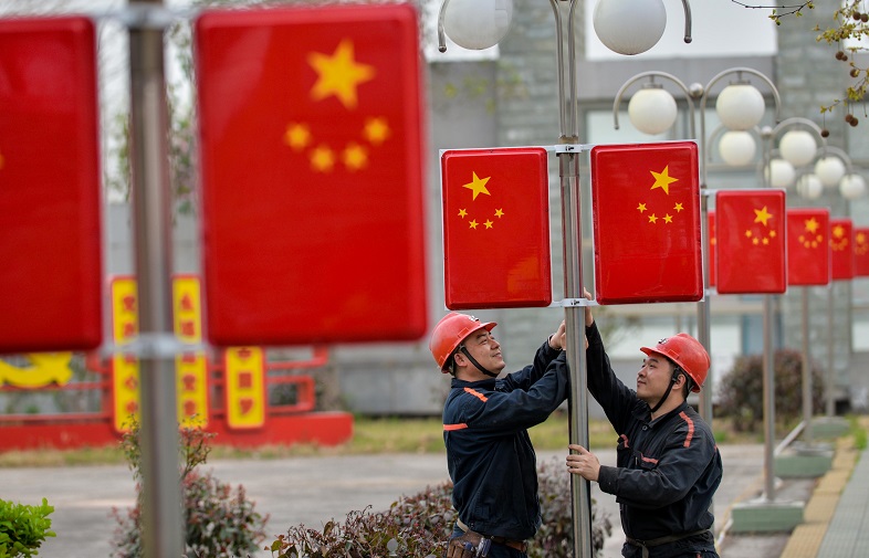 2022年9月26日,朱仙庄煤矿2名工人正在工业广场安装国旗。国庆佳节即将到来,安徽省淮北矿业集团公司朱仙庄煤矿精心营造节日氛围,在工业广场灯杆安装、悬挂国旗,增添节日气氛,喜迎党的二十大胜利召开。