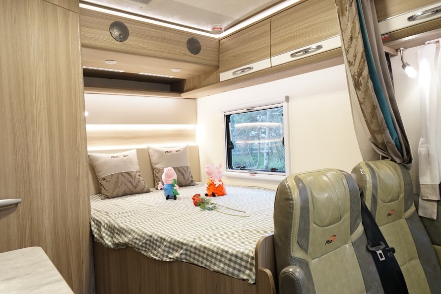 瑞弗V820的车厢内由于双拓展的配置,显得宽敞了许多。驾驶室上方为一张额头双人大床,会客区为对坐式卡座沙发设计,座椅依然为美式皮质座椅,宽大且舒适,餐桌支持升降。