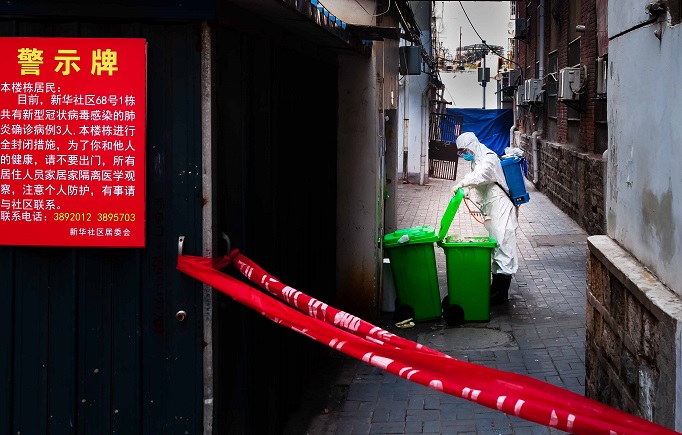 2月12日,淮北矿业集团相王医疗健康主管治疗师金涛在新华社区为居民消毒。(郑洪光 摄)