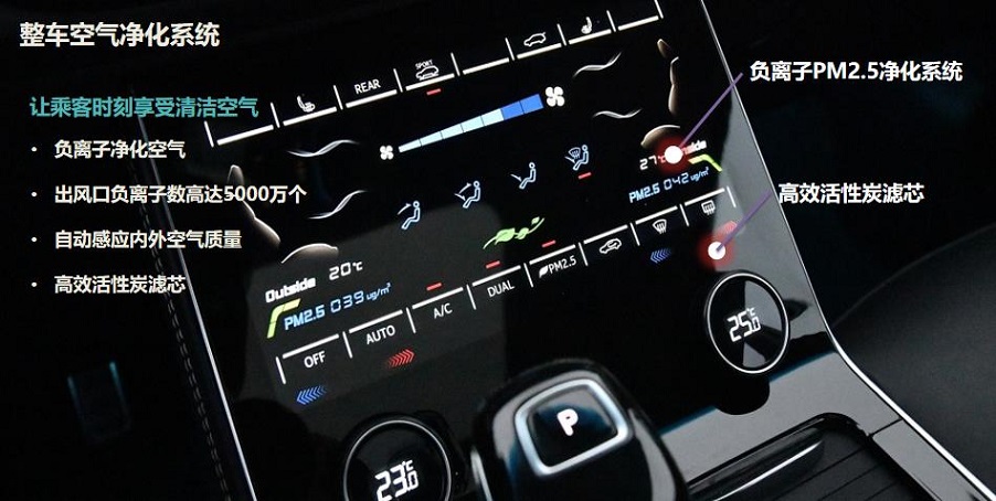 空气净化系统方面,捷途X95配备了负离子发生器及高效空气净化系统,相较于普通汽车空调滤芯,捷途X95搭载的高效活性炭滤芯能够快速有效地过滤空气中细菌、PM2.5等细微可吸入颗粒物,并且可以在空调控制面板上实时显示车内空气质量指数,配合负离子发生器能使空气中的细微颗粒快速沉降,达到高效的空气净化、杀菌的效果,保持车内环境清新健康。