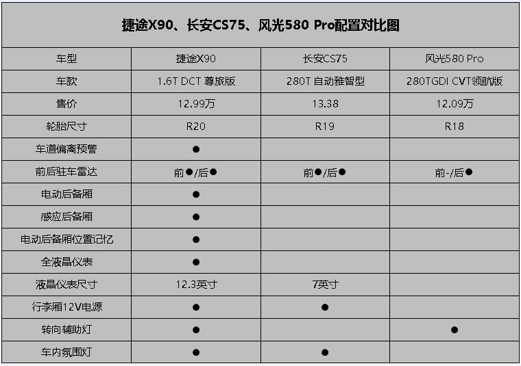 考虑到家用车的安全性,三款车基础的安全配置都有配备,比如安全气囊、胎压显示、ESP、全景影像、自动驻车、上坡辅助等等。不过通过以上对比图可以明显看出,在相近价位下,三款车的配置差异还是比较明显的。风光580pro领航版虽然价格最低,但在顶配车型上还缺失了车道偏离预警、前驻车雷达、全液晶仪表这样的重要配置,并不推荐。而捷途X90在价格有一定优势的情况下,配置上还比长安CS75多出了车道偏离预警、电动感应后备厢、后备厢位置记忆、全液晶仪表、转向辅助灯等多项实用和安全配置,性价比显然更高。
