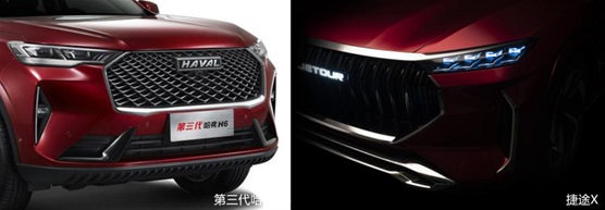 第三代哈弗H6采用了名为“弦韦”的设计语言,最大的改变在于整车风格更加激进和年轻化,比如大尺寸中网以及侧面的凹凸效果等,力量感十足;奇瑞捷途X作为脱胎于概念车设计的全新车型,从最近曝光的部分设计来看,激进的风格同样明显,直瀑式的多边形中网尺寸足够大,棱角分明的前脸线条塑造出了不俗的力量感。