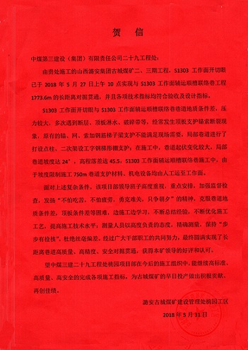 日前,山西潞安矿业(集团)有限责任公司古城煤矿建设管理处桃园工区向中煤三建二十九工程处发来贺信,祝贺该处桃园项目部承建的S1303工作面开切眼与S1303工作面辅运顺槽联络巷实现安全精准贯通。