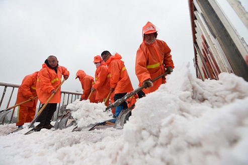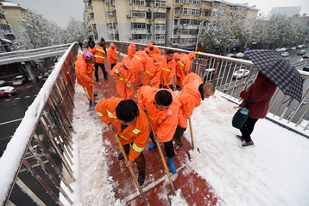 11月23日,在合肥市瑶海区东一环和临淮路交口人行天桥桥面上,环卫工人在道路上铲除积雪。当日,合肥迎来2016年首场降雪天气,为确保辖区立交、人行天桥和主要道路的安全畅通,合肥市瑶海区城管部门组织应急抢险分队对辖区内立交、人行天桥以及主要路段上的路面积雪进行铲除清理,以确保交通畅通及车辆、行人的安全出行。