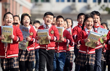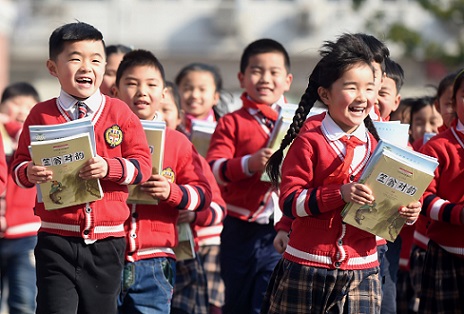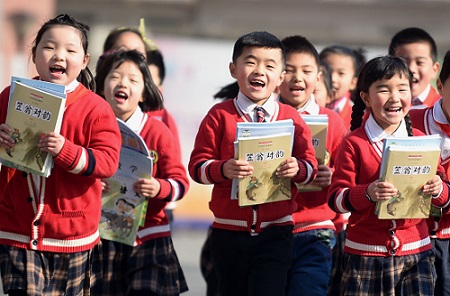 2017年2月12日,在合肥市瑶海区少儿艺术学校,孩子们拿着刚领取的新学期书本,开心的奔跑在校园里。当日,是合肥市中小学新学期入学报到的第一天,合肥市瑶海区少儿艺术学校的孩子们领着新学期的书本,开心地奔跑在校园里,迎接新学期的到来。