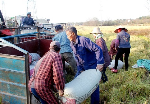 11月23日下午,该县茶岭镇万福村的村民在搬运大型收割机收获的水稻