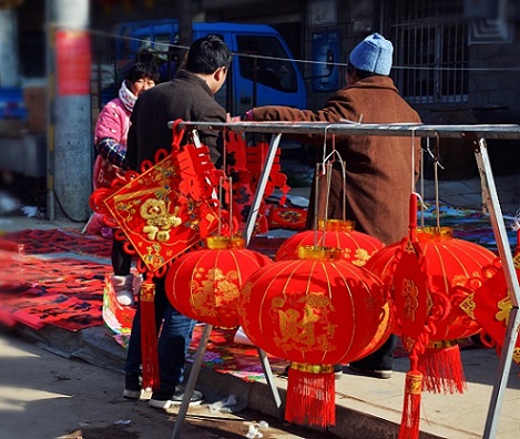 2月8日,杨郢乡街道居民正在集市上选购纸质灯笼,营造新春购物气氛,对联、大红灯笼等红彤彤的元素被商家摆在了最显眼的位置, 随着春节日益临近,越来越多的商家将自己的店铺装扮得更有春节的喜庆感,营造和网上购物不一样的节日氛围,方便了杨郢百姓购置年货。